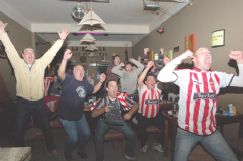 | Villa María no fue ajena al festejo de Estudiantes. Los hinchas "pinchas" de la ciudad siguieron el partido por televisión en un boliche céntrico y después ganaron la calle. Arriba, Fernández marca el empate y se abraza con Verón |
