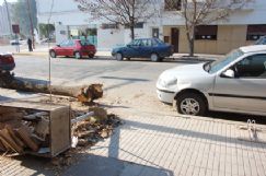 Estaba estacionado en San Juan al 700, y según observó, junto al vehículo acababan de derribar un árbol, que en un particular efecto dominó, volteó también un gran canasto de residuos que impactó en el auto.