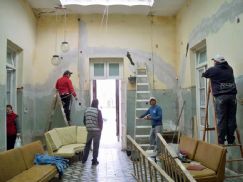 | Obreros ya trabajan en las reparaciones de las paredes del hall principal de la Municipalidad villanovense |
