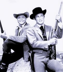 | Artemio “Artie” Gordon, o sea, Ross Martin, y Jim West, es decir, Robert Conrad, posando en los estudios villamarienses que se hallaban sobre la avenida Sabattini |