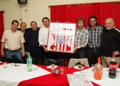 En la fotografía, el momento en que Alumni le entrega a AMMA, como obsequio, la camiseta que el club utiliza en el torneo Argentino A de fútbol. Los dos presidentes están acompañados por representantes de ambas entidades.