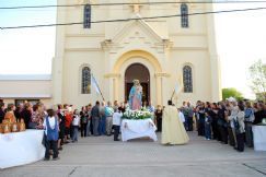 | La imagen del frente del templo y de los fieles que se congregan en torno a la imagen de la Virgen del Rosario - La homenajeada en lo alto y alrededor de un notable número de creyentes, en la Procesión celebrada ayer y encabezada por el padre Dottori |