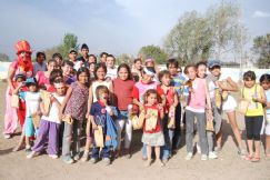 | El grupo posa para el fotógrafo de EL DIARIO antes de la tormenta - Los niños felices con los payasos |