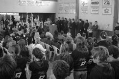 | Autoridades, adjudicatarios de las viviendas y representantes de instituciones, en el salón |