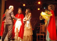 | Arriba el intendente saluda a las reinas entrantes y salientes y princesas. Abajo saludan Gieco y los pibes de Mundo Alas |