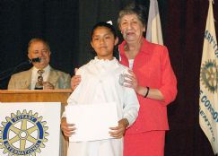 | F1: Cavagliato abraza a una de sus nietas tras recibir el premio. F2: La alumna Ana Flores junto a Carmen Marcariani, del Rotary |