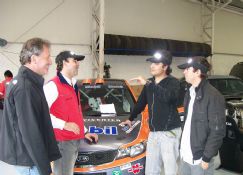 | Nicolás Raies, Gustavo Beccaría (piloto y navegante), Eduardo Valdés, quien invitó a Raies, y EL DIARIO en los talleres de KIA Chile |
