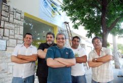 | Los choferes posan para EL DIARIO momentos después de colgar el cartel en la nueva casa |