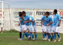 | El "Zurdo" Echevarría, autor del gol del empate, encabeza el festejo del primer tanto de su equipo en Ausonia |