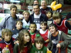 | Los chicos del “expreso rojo” junto a Marcelo Milanesio, el ídolo del basquetbol cordobés |