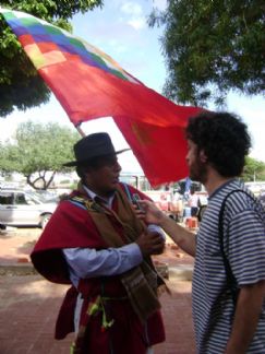 | Los ponchos Rojos son reservistas collas de la región de andina de Omasuyos. En la imagen, en diálogo con nuestro enviado en Santa Cruz, Lino Villca |