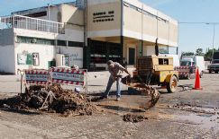 y Sarmiento eran reparados ayer por un grupo de operarios de la Cooperativa de Agua “15 de Mayo”. En nuestra edición