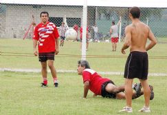 | Desde el suelo. Agüero cabecea en el fútbol tenis y Monserrat lo observa. El técnico de Alumni ahora espera un arquero |
