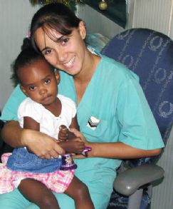 | Corina Fornero, casco azul varillense, junto a una pequeña haitiana (Agencia Telam) |