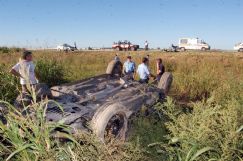 Por razones que son motivo de una investigación, el conductor del coche perdió el control, se salió de la carpeta asfáltica y describió el largo trayecto ya narrado, para terminar completamente de cabeza en la honda y ancha banquina.