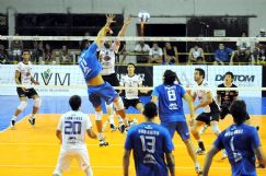 | F1: Jerónimo Bidegain, figura de su equipo y del partido, ataca en un pasaje del encuentro. F2: El “Flaco” Cristian Imhoff, remata ante el intento de bloqueo neuquino |