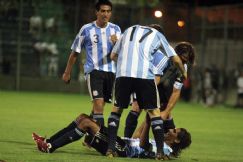 | Emoción. Jara, en el suelo, tras celebrar su conquista con la selección mayor, que le dio el triunfo sobre Costa Rica (foto gentileza Diario de Cuyo de San Juan) |
