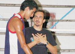 | Cichello le da indicaciones a Pablo Crer durante el entrenamiento. F2: Fabián Armoa, el reconocido entrenador del equipo sanjuanino |