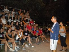 | Las chicas en la tribuna del polideportivo, escuchan al entrenador Eduardo Flores |