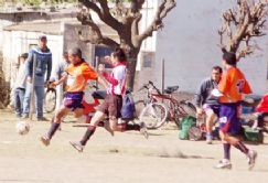 | El jugador de Carnes Delpino intenta desbordar y apura a un defensor de World Net |