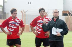 | Hora de jugar. Sebastián Godoy y Luciano Vázquez escuchan a Ranalli. Alumni buscará hoy volver a la victoria |