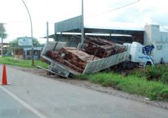 Un camión con semirremolque, cargado con postes y maderos en tablones, protagonizó durante la víspera un accidente de tránsito en el acceso suroeste a Villa María, cerca del Hipódromo y los barrios Mariano Moreno y Las Acacias y precisamente en la misma esquina donde se encuentra el corralón de la firma "El Quebrachal", dedicada a la comercialización de insumos agropecuarios.