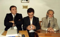 | Oscar Dávila, flanqueado por sus defensores, los abogados Alberto Vieytez Monroy -de barba- y Marcelo Martín Silvano. El juicio seguirá el jueves 4 (foto gentileza RH 1 de Hernando) |