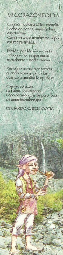Es que Na & Na artesanal, de Capital Federal, lo ha elegido para ser el portavoz de un gesto literario y solidario. Esta editorial que se ocupa de crear productos artesanales como tarjetas, calendarios, anotadores, entre otros, ha impreso una serie de señaladores ilustrados con elfos, duendes, hadas y pinturas aborígenes que han sido matizadas con múltiples colores. En esta edición que corresponde a 2010, la consigna fue seleccionar a un poeta del interior para reproducir sus poemas. Es ahí donde Eduardo Belloccio aparece y complementa la propuesta. Los versos seleccionados están en su versión original y algunos de ellos han sido traducidos a la lengua toba y quechua, por las mismas comunidades originarias de Santiago del Estero y Chaco.
