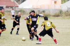 | Encara. El jugador de Transporte Flavio domina la pelota en campo contrario mientras lo espera el defensor rival. En la otra foto, un momento del empate sin goles entre CTS Alimentaria/Rubén Rea y Sindicato Empleados Estación de Servicios/Milo |
