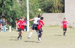 | En lo alto. El delantero de La Bomba peina la pelota pese al salto del defensor rival. F2: el arquero de Drugstore salta y despeja el balón de área |
