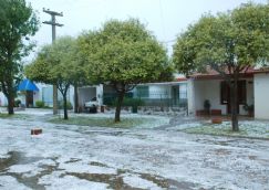 | Las calles y veredas se vistieron de blanco con la caída de granizo y algunas piedras |