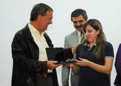| El gobernador deposita en manos de una estudiante, una de las computadoras. En el Comercial quedaron nueve netbooks |