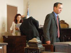 | El fiscal Francisco Márquez dialoga con la secretaria Gabriela Sanz, mientras el defensor “ad hoc”, Eduardo Rodríguez (h), se prepara para iniciar el juicio, que terminó siendo abreviado por la confesión de Mercaú |