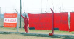 “Jugadores y cuerpo técnico, vamos que se puede”, rezaba uno de los cuatro trapos que colgó el reconocido hincha en el alambrado perimetral de la cancha donde entrenó el plantel.