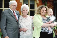 | Edwards posa con la primera “niña probeta”, Louise Brown, junto a su madre y su hijo |