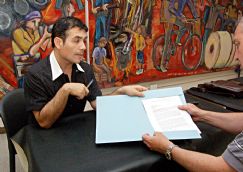 | Arenas en EL DIARIO, entregándole a uno de los coordinadores de Redacción su derecho a réplica. Fue a raíz de una nota por una denuncia penal que se le formuló en julio de 2005 |