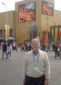 | El periodista villamariense que escribe esta página, ante la gigantografía de Mandela en el pabellón de Sudáfrica |
