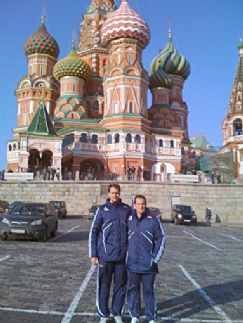 | Los villamarienses Smidt y Bruno en la histórica plaza Roja de Moscú con la tradicional iglesia cristiana ortodoxa rusa a sus espaldas |