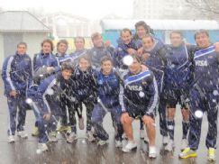 | El entrenamiento de ayer fue bajo la nieve como lo muestra la imagen. Los villamarienses Rodrigo Bruno y Agustín Smidt se ubican en la fila de arriba, de izquierda a derecha en tercero y cuarto lugares |
