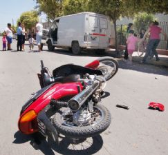 | La moto en la que circulaba Gobatto, en medio de la calle. Al fondo, el utilitario con el que chocó. La policía recoge datos en el lugar del hecho - La Trafic acusó el impacto y la chapa quedó visiblemente abollada del lado del conductor |