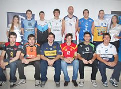 | Los 12 equipos representados por uno de sus jugadores en la presentación de la Liga A1, días atrás. El primero de la izquierda, en la fila de abajo, es el jugador del Villa María Vóley Mauricio Viller |
