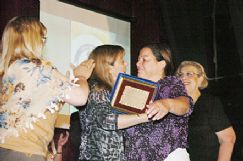 | Alicia de Quevedo, destacada por su Copa de leche - Por primera vez, un premio Mejor Compañero de la Escuela “Salvato”. Fue para Nahuel Nicolás Oviedo - El numeroso grupo de la lavandería de Carlón festejó el premio en el escenario |