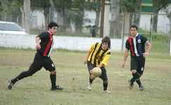 | Pelota al piso. Ulises Bonaveri se lleva la pelota entre dos jugadores. El joven atacante luego salió lesionado |