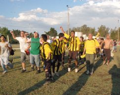 | Jugadores y allegados del club “aurinegro” en plena vuelta olímpica. Unión Central ganó en Ticino y se consagró campeón del ascenso |