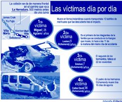 La tragedia alargó su dura mano y volvió a golpear a la familia Etchemendy, prácticamente desecha como consecuencia de un accidente de tránsito en cercanías de esta ciudad hace 16 días. Dejó de existir ayer Carlos David Etchemendy, de 36 años, transformándose así en la cuarta víctima fatal que se cobró el accidente entre un automóvil en el que circulaba un joven bellvillense y un utilitario en el que se trasladaba una familia domiciliada en la zona rural cercana a Villa María. El choque, como se recordará, tuvo lugar temprano en la mañana del 9 de noviembre pasado, en el camino de ripio que conecta Villa Nueva con La Herradura. Etchemendy era padre de dos de los pequeños Lautaro (5) y Esteban (7), quienes fallecieron también por las heridas sufridas en el siniestro. De acuerdo con lo informado por fuentes médicas, Etchemendy nunca salió de su cuadro de coma profundo, producto de las múltiples y graves heridas sufridas en el accidente, las cuales lo llevaron a la Unidad de Terapia Intensiva del Hospital Pasteur, donde falleció ayer. En el acto Cabe mencionar que como consecuencia del impacto, el conductor del Renault 19, identificado como Miguel Agüero, de 25 años, falleció en forma instantánea. A las 11 de aquella misma mañana falleció el primer ocupante del Kangoo: Lautaro Etchemendy, de 5 años. Después de la trágica colisión, la Policía secuestró 12 "ladrillos" de marihuana y varias "tizas" de cocaína que los Bomberos habían encontrado en el rodado en que se conducía este muchacho (ver infografía). Internados Por otra parte, hay que decir que aún permanecen internados la esposa de Etchemendy, Rosa Ferreyra, de 35 años, y el tercero de los hijos del matrimonio, Martín, de 11 años, quienes también iban a bordo del Renault Kangoo que fue embestido por el Renault 19 aquella trágica mañana. Horas después de fallecer Miguel Agüero, conductor del Renault 19, murió Lautaro Etchemendy. El pasado martes, se produjo el deceso de Esteban Etchemendy, de 7 años. Ayer, su padre, Carlos David.