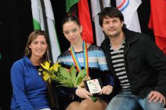 | Lucrecia, junto a sus entrenadores Patricia Bruno y Flavio Fissolo, luego de recibir su medalla de plata |