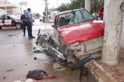 | Moto, auto y columna, un conjunto que muestra lo tremendo del accidente. En otra de las fotos el Volkswagen Gol que, tras el impacto, quedó sobre la vereda |