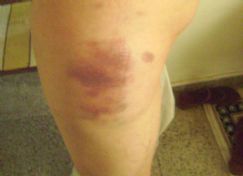 | El hematoma más grande que presenta la docente en su cuerpo está ubicado en el muslo de la pierna izquierda. También presenta moretones en otros lugares del cuerpo ( (fotos proporcionadas por Sonzini) |