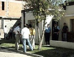 | Frente de la casa donde ocurrió la tragedia. El hombre de espaldas, al lado del árbol, es el padre de los niños asesinados (foto gentileza La Voz del Interior). Los hermanitos fueron sepultados en el mismo féretro, en el nicho de arriba |