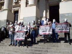 El grupo de manifestantes llegó desde Villa María y en la hora pico sus integrantes se calzaron máscaras con los rostros de Roganti, Márquez, Bessonart y otras caretas blancas que recordaban a los 25 asesinados.